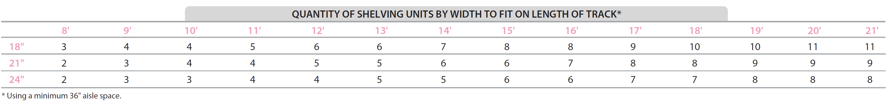 Ex:TTK17-1848GY = 17' pair of overhead tracks plus two end shelves w/ 18" x 48" shelves and carts = 20ft total